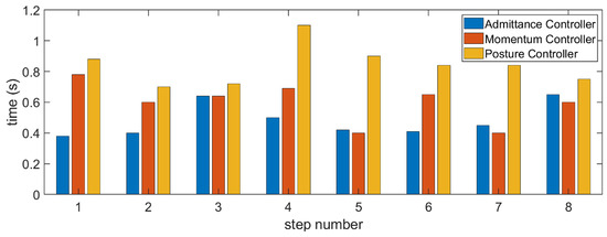 We recorded the convergence time of each controller in a walking process, and obtained the histogram shown in Figure 12. It can be seen from the figure that in most cases, the admittance controller reached the stable state first; then, the momentum controller and the posture controller reached the stable state, respectively. The time distribution meets expectations.