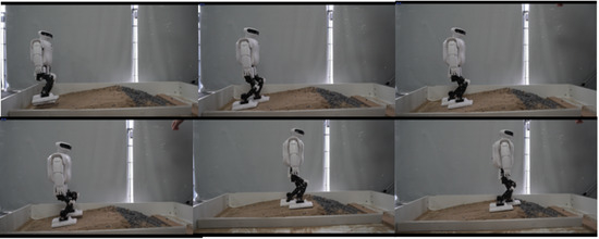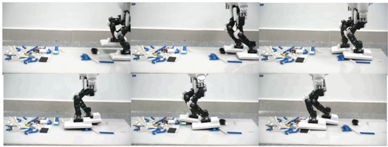 We experimented with structured uneven terrain walking and soft-ground walking. The step time cycle was about 2.0 to 3.5 s per step, which was limited by the controller convergence time and was different in every step. The step length was about 8 cm, which was limited by the kinematic constraint and walking stability and was determined empirically. The obstacle height was about 2 cm, approximately 3.3% of the total body height of 65 cm. The video frame capture of walking on structured uneven ground is shown in Figure 13 and Figure 14. In the double support phase, three controllers act simultaneously, and due to the quasi-static gait, the robot will reduce its speed to zero in this phase. When the robot steps on different ground, the interference to the robot is different, and the adjustment time is also different. Therefore, we should set up the blocking mechanism of the controller. That is, we set the control objectives for the three controllers, and only when all the controllers have completed the control objectives, is the robot’s bipedal support phase considered to be finished. Then, the next step of walking is started. The control objectives include angular momentum less than 0.05 N·m·s, trunk inclination less than 0.05 radian, and contact wrench measured with the FSR sensor less than 0.09 Nm.