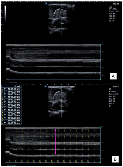 Raw M-mode ultrasound imaging (A) and thickness measurement (B).