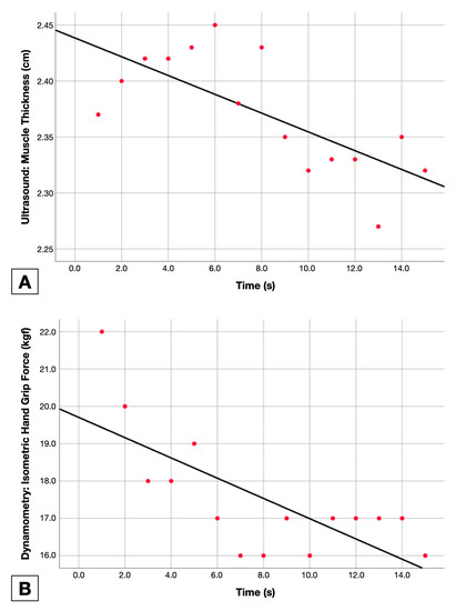 This study aimed to analyze the convergent validity of muscle activity assessed with EMG, muscle thickness assessed with US and isometric prehensile force assessed with dynamometry for measuring muscle fatigue. To our knowledge, this is the first study using adjusted line slopes with these tools to compare the association between them for measuring fatigue indicators such as electrical activity, muscle thickness and force capacity. Our findings showed significant weak associations between all methods, suggesting the use of all of them to provide synergistic information in the fatigue assessment, as it seems to be sensitive to different aspects and overcomes the limitations introduced previously (e.g., use of US for evaluating deep muscles not accessible with EMG). These findings could assist both clinicians and researchers to acquire overall information. The rationale for selecting the forearm muscles was supported by the anatomical disposition, which allows the simultaneous assessment with EMG, US and dynamometry and highlights the clinical importance of this muscular group [35]. Previous studies highlighted the importance of hand grip force as it is associated with a greater impact of rheumatoid arthritis [36], fibromyalgia [20], sarcopenia [37], cancer [38] or diabetes [39]. Additionally, it is considered an important predictor of mortality associated with falls [40,41] and heart failure [42].