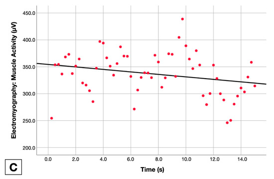 The surface EMG provided the muscle activity (expressing the amplitude in μV) during the 15 s test. Previous studies demonstrated the use of the flexor digitorum muscle during this task [32,33]. Data for each 0.25 s were collected and analyzed to measure muscle activity fatigue.