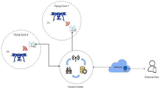 - Drone (): A drone collects the data in their particular flying zone and must be registered by the control center to communicate with . Then, sends the data to = through the control center. Moreover, has restricted computation and storage capacities.