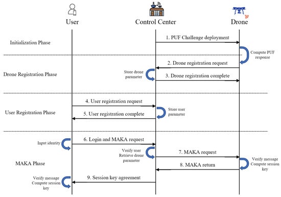 The proposed scheme consists of the following phases: (1) initialization; (2) user registration; (3) drone registration; (4) MAKA. We show the flowchart of the proposed scheme in Figure 3. The proposed scheme is lightweight as it uses only the cryptographic one-way hash function and exclusive-OR operations, apart from the fuzzy extractor and PUF technique that is needed for verification at the user side and drone side, respectively.