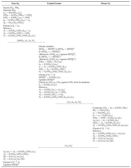 Akram et al. [4] suggested a drone-access authentication protocol for surveillance tasks in a smart city. Akram et al.’s scheme is composed of the following phases: (1) user registration; (2) drone registration; (3) authentication and key agreement (AKA) phases. Table 2 shows the whole notation and description in their scheme.