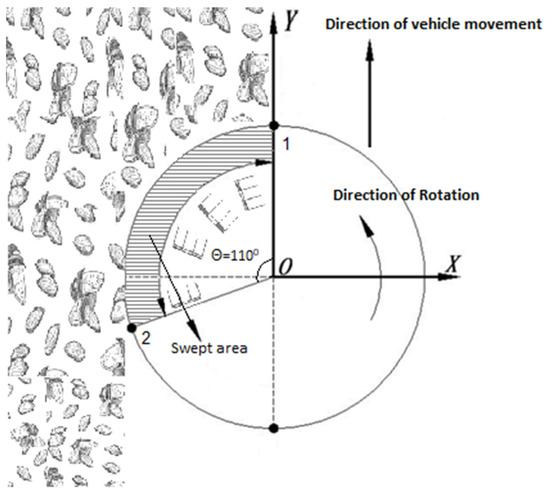 If = , there is only one tangent point between point “a” trajectory and point “d” trajectory, and = at this moment, and the repeat-raking zone is the least, this is the optimal working state. If > , there would be a larger repeat-raking zone, a faster movement speed, and a lower disc rotational speed, which can lead to improved brush performance. The ideal working condition for the brush is achieved when there is no gap or minimal overlap between the adjacent working areas of the tines. This ensures that all the area in front of the brush is effectively swept and that the tines are functioning optimally; therefore, this means − ≥ 0. Based on the detailed parameters, we obtained: