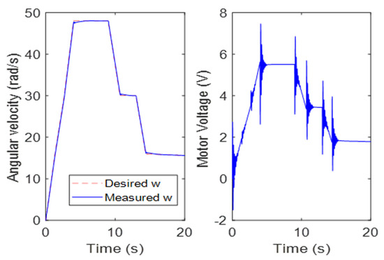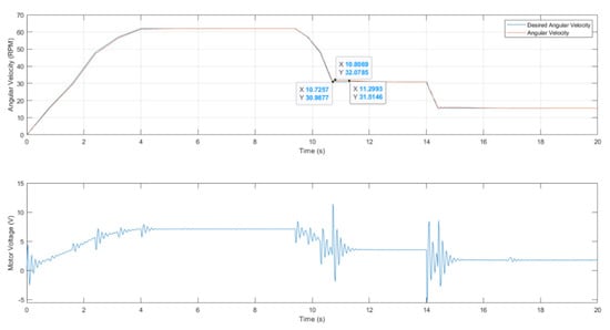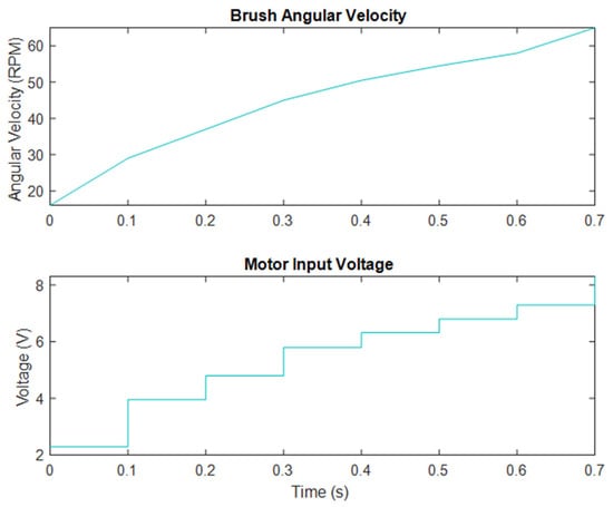 The brushes in question are equipped with a Zipo electric motor, identified by the model number ATP50. This motor is responsible for powering the brush, and its output torque was boosted using chains and sprockets, which connect the motor shaft to the brush shaft. The electrical motors used in this study were analyzed, and their dynamics were determined through experimentation and the use of the MATLAB System Identification package. Unfortunately, the transfer functions for these motors were not readily available, so an experimental approach was taken to understand the electrical motors and brush dynamics. To accurately measure the performance of the sweeping system, two different instruments were employed. The first was a tachometer, which was used to determine the forward speed of the system. Additionally, a spindle speed meter sensor was used to measure the rotational velocity of the sweeping brush. The sweeping motor had a limited maximum angular velocity of 65 RPM, which was a key factor in determining the maximum forward speed. According to the results of Equation (5), this maximum forward speed was limited to 10 m/s. To further analyze the system, a graph was created showing the relationship between brush angular velocity and motor input voltage, as depicted in Figure 4. To gain a deeper understanding of the system’s dynamics, the MATLAB System Identification Toolbox was used to conduct a detailed analysis.