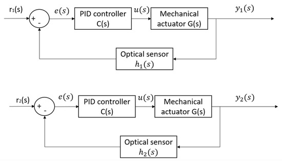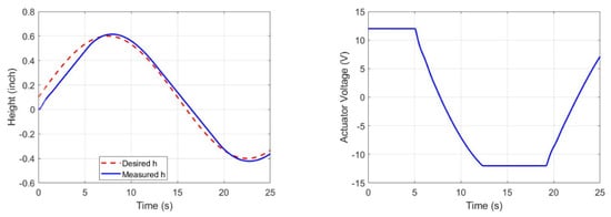 The left graph in Figure 8 provides a visual representation of the response of the front brush height control, as well as the voltage that is applied to it. As the actuator voltage graph indicates, the voltage remains constant at 12 volts from time 0 to 5 s and then changes to −12 volts from time 12 to 18 s. It is important to note that our actuators have a maximum capacity of 12 volts, so they cannot exceed their rated voltage when more power is needed. In the right graph in Figure 8, we can observe the impact of saturation on the actuator response time, which results in a decrease in the lift up/down speed during the period of saturation. The slow response time of the actuator is due to the limitations imposed by saturation, which negatively affects the overall performance of the system. To overcome this issue, engineers and designers need to consider ways to prevent saturation from occurring, so that the actuators can operate at their maximum potential, providing fast and reliable control over the front brush height. The control system block diagram for two front brushes is represented in Figure 9.