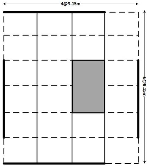 The direct method is used to model the massless soil domain in which the FEM model is developed and boundary conditions are enforced upon it. The width of the soil domain is taken as three times the width of the building, and depth is taken as equal to the height of the building. For a satisfactory analysis, the width of the soil model should be three times the length of the structure [55]. The soil mesh is created in such a way that the desired aspects of the propagating waves are captured in the analysis. The minimum vertical element size in the soil column is set by the horizontal size of the elements. The number of elements is determined by the thickness of the soil deposit. Thus, for n total elements there will be 2n + 2 total nodes. The bottom portion is fixed to behave as a rock and the sides are free. Isoperimetric four-node quadrilateral finite elements having two degrees of freedom per node are used to model the soil region. The plane strain condition is considered using the elastic-isotropic material model in OpenSees. Equal DOF command is used in both horizontal and vertical directions to connect the structure with the soil. Common nodes and suitable constraints are used to achieve equal displacements for the two domains. Lysmer–Kushlmeyer dashpots are introduced for the radiation damping and prevention of reflection of outward-propagating dilatational and shear waves back to the structure [56]. The mentioned dashpots are enough to satisfy the radiation damping conditions. A 5% damping ratio is applied as the typical soil damping conditions are in the range of 3% to 10% [57]. The range of elastic modulus is 478 to 210,000 kN/m2 and the range of Poisson’s ratio is 0.2 to 0.45.