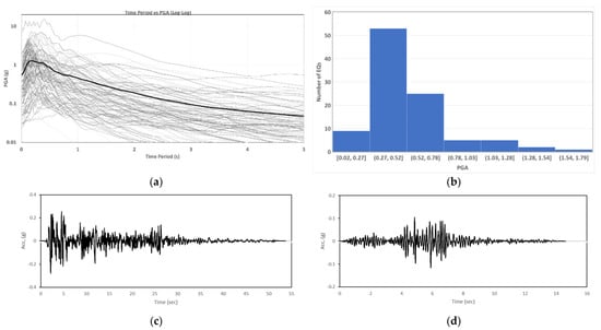 The earthquakes considered as input. (a) The response spectra of 100 input earthquakes. (b) The histogram of PGA ranges of the EQs. (c) The time history of Imperial Valley EQ. (d) The time history of Northern California EQ.