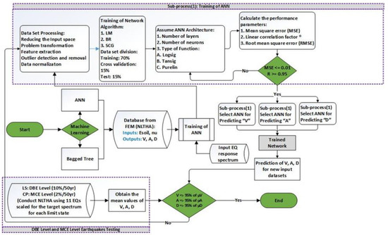 The methodology used to apply the machine learning techniques is discussed in this chapter. Figure 5 shows a flow chart of the complete process. First, the machine learning method is decided then the database is established, which is obtained from FEM analysis to train the network, and then it is tested to predict the output. Before training, outliers were removed and the data were trimmed to be reasonable. Afterwards, different algorithms are used for training. A total of 70% of the data is used for training, 15% is used for cross validation, and 15% is used to test the data. The type of the algorithm, the number of layers, the number of neurons, and the type of the function are varied to achieve the best ANN architecture based on the mean square error (MSE) and the linear correlation coefficient (R) values. The selection criteria for MSE are less than or equal to 0.01 and for the R are greater than or equal to 0.95. Then, the trained network is tested with the help of 22 earthquakes considering maximum considered earthquake (MCE) and design-based earthquake (DBE). The ANN is trained on a three- and a five-story structure and tested on a four-story and a three-story mass irregularity structure.