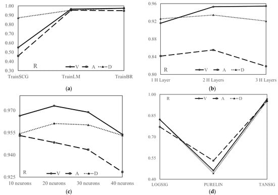 The effect of different parameters on the performance of the ANN. (a) Effect of the algorithm. (b) Effect of the number of layers. (c) Effect of number of neurons. (d) Effect of the type of function.