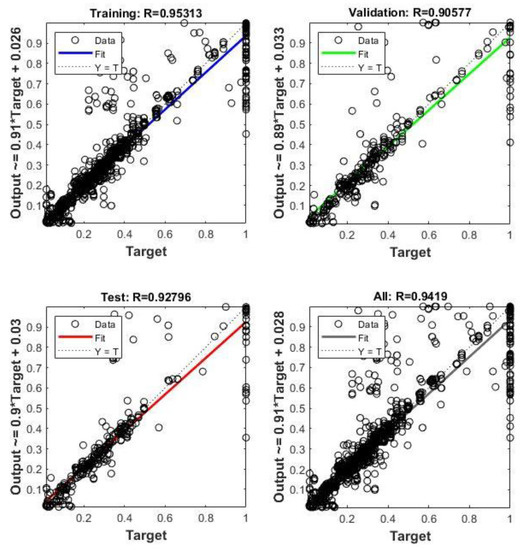 To conclude, a combination with the best results was selected and used for further comparisons and calculations. ANN with two hidden layers, 10 neurons each, TrainLM algorithm and TANSIG function showed the most accurate results. To demonstrate this statement further, the R values for each of Training, Validation, Test and All are shown in Figure 7, Figure 8 and Figure 9. The R value is greater than 96% in the case of base shear, 90% for acceleration, and 94% for drift predictions.