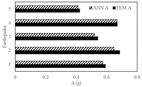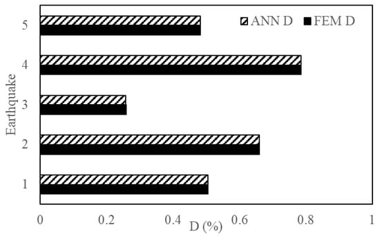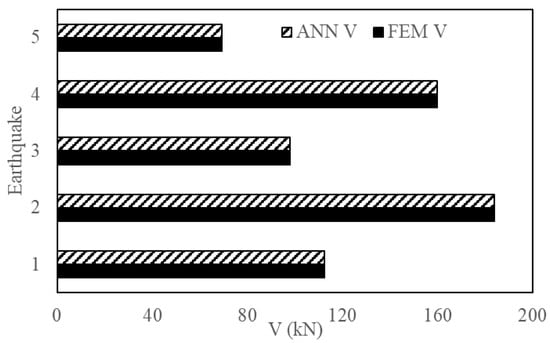 This section reports the performance and accuracy of the proposed method. The generalization potential of the proposed method was examined by introducing new EQs to test the ANN framework. The characteristics of these EQs are given in Table 3. The ML results are validated with the FEM simulation results. Figure 13, Figure 14 and Figure 15 show the output engineering demand parameters (base shear, acceleration, and maximum inter-story drift) of a four-story structure predicted by the ANN, which was based on three- and five-story structures. For the selected earthquakes, the ANN framework showed accurate results when compared with the NLTHA.