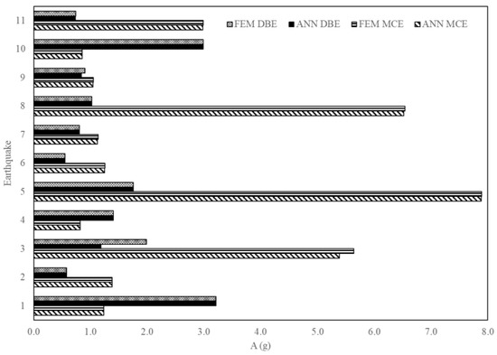 Similarly, the ANN model is also tested on a three-story mass irregularity structure. The earthquakes, this time, consisted of design-based EQs (DBE) and maximum considered EQs (MCE) to achieve meaningful results and to compare them with the results obtained from other conventional methods. Table 4 lists the characteristics of these EQs. Figure 16 shows the design spectrum of these EQs.