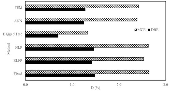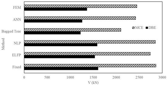 Then the results of the proposed method were compared with those of the conventional methods for SSI seismic response. The FEM is again taken as reference for this comparison. Figure 20 and Figure 21 are the comparison of V and D values from ANN, SVM, and ASCE 7-16 methods. It is noted that ANN is the closest to the FEM (NLTHA) outputs compared with other methods. Thus, ANN is the most reliable method among the techniques discussed. Table 5 and Table 6 show the quantitative results. ANN predicted approximately the same as the FEM results, whereas the fixed-base method showed higher values compared with the equivalent lateral force procedure (ELFP) and ML techniques. ELFP showed results close to FEM compared with the bagged tree (SVM) method but the values were higher than the FEM method. The error percentage for ANN was less than 2% for MCE and below 8% for DBE with the FEM (NLTHA) as a reference. The proposed method is superior over the conventional techniques. For example, Table 6 shows, in the case of MIDR, ELFP overestimated the results by 10.94% and 4.54% for the DBE and MCE levels, respectively. In the fixed case, these values increased to 15.63% and 9.09%, respectively, and in the NLP case they increased to 14.10% and 8.68%, respectively. However, in the ANN case, the difference was reduced to 0.03% and 1.23% for the DBE and MCE levels, respectively. In the case of V, the ELFP overestimated the results by 12.53% and 11.89%, respectively. Other ASCE methods showed more conservative results than the ELFP. However, the differences in the case of the ANN were reduced to 7.75% and 0.96% for the DBE and MCE levels, respectively. This shows that the proposed framework provides a higher accuracy in predicting V and D compared with conventional ASCE methods. It was found that the bagged tree technique underestimates the response values in general.