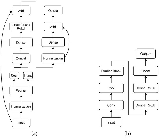 The Neural Fourier Energy Disaggregator (NFED) [62] could be considered as a member of the transformer family [63,64,65,66] due the fact that it is based on FNET [67], a transformer in which the attention layer is replaced by Fourier transformation as an efficient alternative. In comparison to state-of-the-art-models, NFED achieves similar performance with lower computational cost. NFED is composed of fully connected and normalised layers along with two main residual connections. The architecture is depicted in Figure 3.