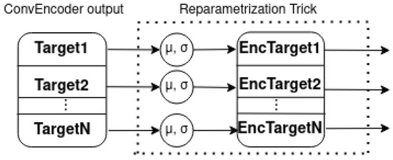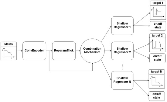 In order to successfully estimate the target distributions, the output of the encoder is divided by the number of targets into equal vectors, as shown in Figure 9. Then, the mean and standard deviation are learned for each target vector and, using the reparametrization trick, the corresponding encoded vectors are sampled. Then, with the same statistics, the KL-divergence for each target is computed. It should be noted that the proposed architecture as well as the various versions were implemented using Torch-NILM; the code is availabe at https://github.com/Virtsionis/torch-nilm, accessed on 17 January 2023.