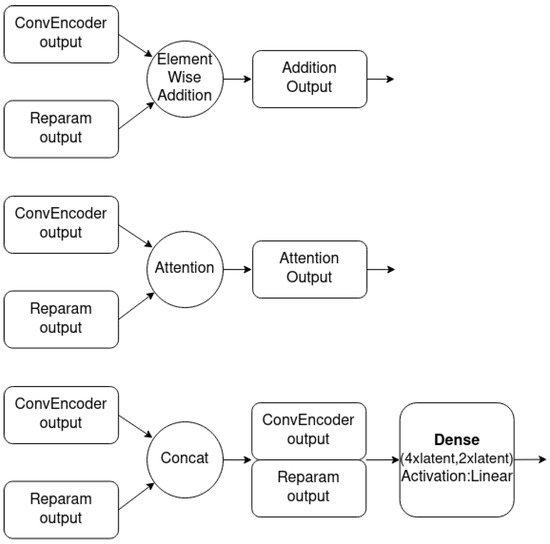 In the current study, three lightweight and efficient combination methods were used. First, a simple element-wise addition of the two vectors was used. In this case, the addition acts as a residual connection [68] between the input of the ReparamTrick module. The idea is to provide the model with information extracted by the ConvEncoder in order to help in the training and fight any degradation issues [69]. Second, a dot attention mechanism [70] was used to help the model focus on the most significant parts of the two vectors. In addition, a dense neural layer with linear activation was trained in order for the model to learn to combine the vectors automatically.