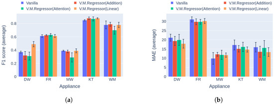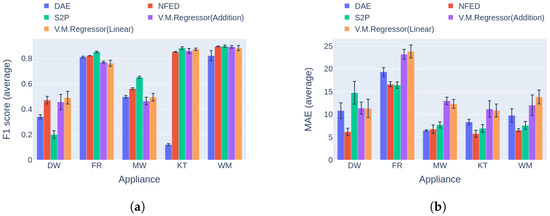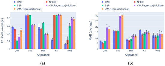 The final comparison in this experiment is based on the second category of benchmark [42]. After reviewing the results in Figure 17, it is obvious that V.M.Regressor outperforms the single-target models in terms of F1 score for the washing machine, with similar performance for the kettle and dishwasher. For the rest of the appliances, there is a large difference between the single-target models. It should be noted that none of the single-target models performs the same in disaggregating all the appliances. Hence, a different model could be more applicable for specific appliance disaggregation. On the aspect of power estimation, all models produce similar errors for three out of five appliances, except for the dishwasher and the fridge, where V.M.Regressor produces errors almost 15 Watts larger than the competition, reaching almost 30 Watts for the fridge. The newer types of fridges usually operate around 80–150 Watts, meaning that 30 Watts of deviation in power estimation is almost 20–38% of the total power level. On the other hand, a 20-Watt miscalculation of an average dishwasher end use corresponds to 5–10% of the operating power level, which is tolerable.