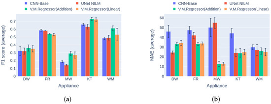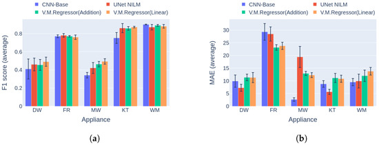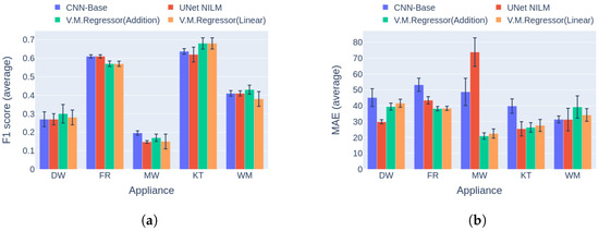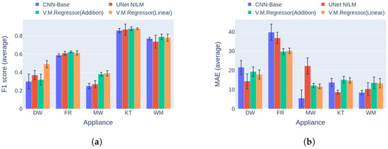 The third experiment was a direct comparison of the novel deep learning solution versus two multi-target architectures introduced by Faustine et al. [31], namely, the UNet NILM and CNN-Base networks. In the original implementation, UNet NILM achieved high performance in comparison to the CNN-Base model on experiments with the UKDALE dataset, and it is considered a strong opponent. In the current work, UNet NILM was adjusted to perform regular instead of quartile regression following the sliding window approach [27]. In this comparison, the best two variations of V.M.Regressor were used, that is, the versions with the addition and the linear combination mechanism.