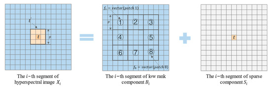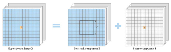 where ( represents the total amount of the spectral bands in the HIS, and represents how many pixels there are in the HIS), is a matrix with low-rank properties to represent the background components, is a matrix with sparse features containing anomalies, and is a matrix representing noise.