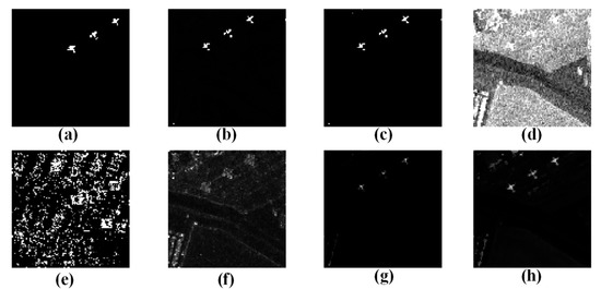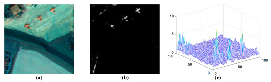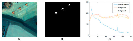 The following section provides additional and more thorough descriptions of these two datasets. The first dataset is the San Diego airport scene, and it is obtained by an airborne visible/infrared imaging spectrometer (AVIRIS) sensor. It has an initial dimension of 400 × 400 pixels, including 224 wavebands, and the spectral wavelength range was 370–2510 nm. In the experiment, since the original image is a little larger, we split a smaller subset from it. The removed subset contained 100 × 100 pixels. Considering bad bands, bands with low signal-to-noise ratio and water absorption area, the following bands (1–6, 33–35, 97, 107–113, 153–166, and 221–224) were removed, leaving only 189 effective bands, as shown in Figure 4a [9,41,42]. The three aircraft in the figure are considered as expected abnormal targets, and Figure 4b shows the corresponding real ground positions. The spectra of the main ground objects are shown in Figure 4c. We can see that the abnormal spectral curve is very different from the background.