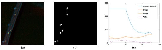 The second dataset is the PaviaC scene dataset. It is downloaded from the computational intelligence team at Basque Rural University. The dataset is obtained using a reflective optical system imaging spectrometer (ROSIS) sensor, and it accurately reflects the ground truth of the Pavia Center in northern Italy. The pixel size of the initial dataset is 1096 × 1096 pixels, 102 spectral bands and a spectral range of 430–860 nm. During the experiment, we divided a subset from the initial image into 100 × 100 pixels-sized pieces and selected 102 bands from the subset. In this scene, there are three ground objects, which are a bridge, water, and shadow. The bridge cars and the barren earth along the pier were considered abnormal pixels in the scene. Figure 5b shows the basic facts of the exceptions. The spectra of the main ground objects are shown in Figure 5c. From the figure, we can see that the anomaly has a spectral curve significantly different from the background.