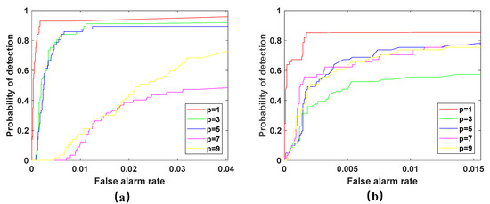 It can be seen from Figure 6 that in both scenes, when the rank is 1, the detection effect is the best, and with the increase of the rank, the detection performance is seriously affected, and the detection rate drops suddenly, especially in the PaviaC scene. It can be seen that the detector is very sensitive to the value of the parameter p, and the improper rank value will significantly affect the performance of the detector. If the value of rank is too high, the anomaly will be divided into low-rank components, and the detection performance will be reduced. For some more complex scenes, the rank cannot be too small, because it will lead to a lack of capture of the variability of the background spectrum, thus reducing the detection performance.
