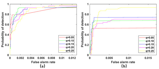 It can be seen from Figure 7 that in the San Diego scene when q is 0.05, the detection effect is better, and when is 0.1, the detection rate is also higher, but at the same time, the false alarm rate is also higher than when q is 0.05, and then with the increase of q value, the detection performance continues to decline. In the PaviaC scene, when the value of q is 0.15, the detection performance is the best. The detection performance first increases and then decreases with the increase of q. Therefore, the detector is also very sensitive to the value of parameter q. When the value of q is inappropriate, it will significantly affect the performance of the detector. This is mainly because, at first, with the increase of q, more anomalies are divided into the anomaly matrix, thus improving the performance. However, when the value of q is too high, it will cause the background or noise to be divided into the anomaly components, resulting in a decline in detection performance.