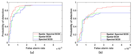We compare the detection results of the spatial spectral weighting coefficient with the spatial weighting coefficient and spectral weighting coefficient to illustrate the full use of the proposed spatial spectral weighting factor SCDI for the “spatial spectral integration” feature of hyperspectral images. As shown in Figure 8, in both scenarios, the detection results of the spatial spectrum weighting factor are significantly better than the other two.
