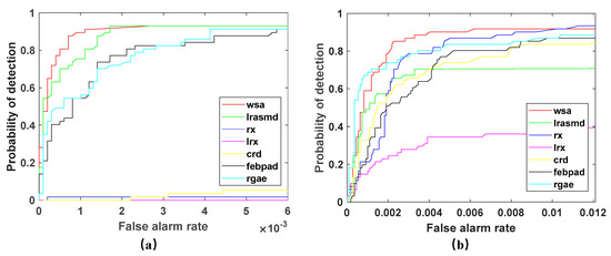 ROC curves of detection results of two scenes. (a) San Diego scene; (b) PaviaC scene.