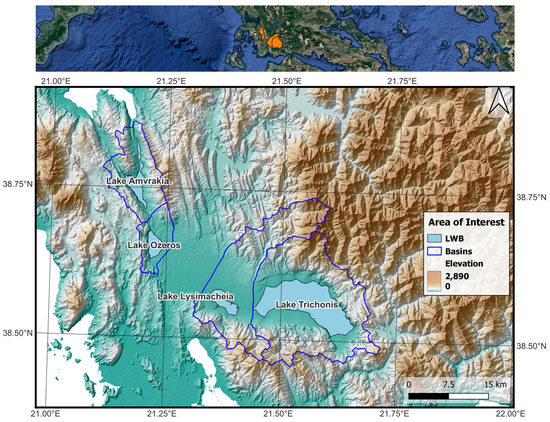 Upper: Basins of lakes Trichonis, Lysimacheia, Ozeros, and Amvrakia, and their locations in Greece. Lower: Detailed view of the above lakes (LWB) and basins in SW part of western Greece with a digital elevation model background.