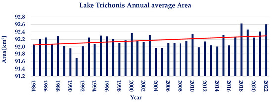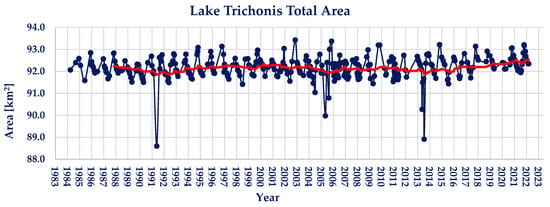 The annual average of water area for lake Trichonis is presented in Figure 6. It is calculated that no significant trend is detected, despite a graphically observed slight positive trend. Lake Trichonis shows insignificant interannual water area variations during the examined 39 years, with the annual water area varying between −0.53% and +0.49% from the annual water area average of 92.17 km2. The Pettitt test conducted on the available annual timeseries does not show a statistically significant point of change. Moreover, the Mann–Kendall test resulted in p ≈ 1 and ΖΜΚ = 1.84, depicting a nonsignificant positive trend.