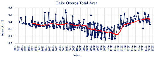 Landsat family derived lake Ozeros water area timeseries (red line; 2-year moving average).