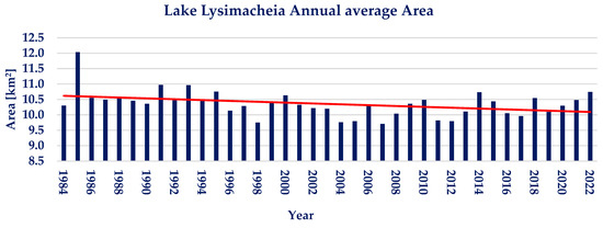 The annual average of the water area for lake Lysimacheia is presented in Figure 7. It is calculated that no significant trend is observed, despite a graphically observed negative trend. Lake Lysimacheia shows small interannual water area variations during the examined 39 years, with the annual water area varying between −6.27% and +13.94% from the annual water area average of 10.35 km2. The Pettitt test conducted on the available annual timeseries does not show a statistically significant point of change. Moreover, the Mann–Kendall test resulted in p ≈ 1 and ΖΜΚ = −2.06, depicting a nonsignificant negative trend.