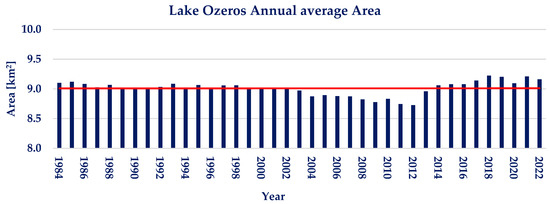 Lake Ozeros’ water area measurements are presented in Figure 4. The maximum area observed is 9.43 km2, whilst the minimum area observed is 8.60 km2. The average water area of lake Ozeros during the observed period of 39 years is found to be 9.00 km2. During the period examined, lake Ozeros shows relatively small water area changes, with the maximum water extent being 4.81% larger than the average, and the minimum being 4.43% smaller.