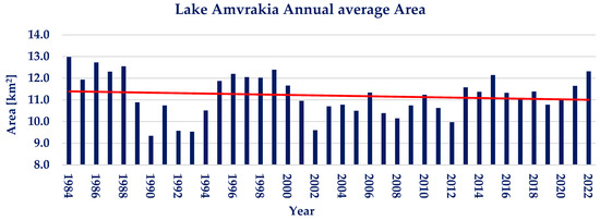 The annual average of water area for lake Amvrakia is presented in Figure 9. It is calculated that no significant trend is observed, despite a graphically observed slight negative trend. Lake Amvrakia shows moderate interannual water area variations during the examined 39 years, with the annual water area varying between −16.62% and +13.69% from the annual water area average of 11.2 km2. The Pettitt test conducted on the available annual timeseries does not show a statistically significant point of change. Moreover, the Mann–Kendall test resulted in p ≈ 1 and ΖΜΚ = −0.73, showing a nonsignificant negative trend.