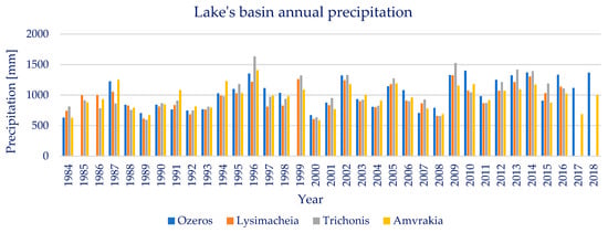 In-situ daily precipitation measurements for the four lakes’ basins were collected from the “Hydroscope” project’s online portal (http://www.hydroscope.gr/, accessed on 1 December 2022). Fourteen hydrometeorological stations were selected within the basins of the four lakes and their precipitation data were downloaded from the portal. The stations’ locations are Analipsi, Gavalou, Thermo, Kallithea, Lepenou, Poros Riganiou, Stamna, Ag. Vlasios, Achira, Monastirakion, Sargiada, Stanos, Lesinio, and Trikorfo. Their altitude varies from 2 m.a.s.l. to 852 m.a.s.l., and they are all operated by the Hellenic Ministry of Environment and Energy. The available datasets cover almost the entirety of the water area timeseries, containing the years from 1984 until 2016–2019.