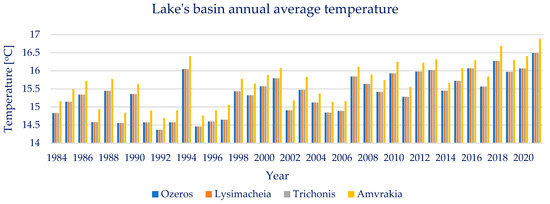 ERA5-Land reanalysis data for the four lakes’ basins were collected from the EU Copernicus Climate Change Service online portal (https://cds.climate.copernicus.eu, accessed on 1 December 2022). The ERA5-Land reanalysis dataset provides 2 m above ground temperature data at a maximum temporal resolution of one hour, and a spatial resolution of 0.1 degree. For the purpose of the present research, the downloaded data consisted of the monthly average temperatures, containing the years from 1984 until 2022, fully covering the water area timeseries. ERA5-Land reanalysis products are considered ideal in cases of scarce in-situ data, as in the case of western Greece where there is a lack of open access temperature data. Moreover, ERA5-Land data have a growing usage in hydrology and remote sensing applications [57,58], thus they are considered suitable for the purposes of the present research.