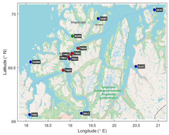 The Norwegian Mapping Authority (NMA) operates a nation-wide NRTK positioning service “CPOS” (https://www.kartverket.no/en/on-land/posisjon/guide-to-cpos (accessed on 15 January 2023)). The service is supported by a CORS network of about 270 permanently installed receivers located across Norway. For this study, a cluster of eight CORS receivers (seven reference receivers and one monitor) covering the area around Tromsø (69.6° N, 18.9° E) were selected. These specific CORS receivers used by the CPOS service will be referred to as CPOS receivers hereafter in this article. This cluster was expanded by five additional receivers during early 2021. It is noted that these additional receivers were deployed mainly for research purposes, thus they do not serve as a part of the CPOS network. While this combination of GNSS receivers is not homogeneous, i.e., it is comprised of different geodetic grade receiver and antenna makes and models, it is believed that this fact has a negligible impact on the analysis presented in this paper. The map of the considered receiver cluster indicating receiver type (CPOS reference/CPOS monitor/test) is shown in Figure 1. An overview of station code, receiver coordinates, and receiver models used is provided in Table 1.