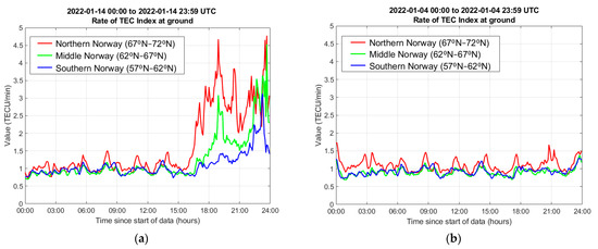 Rate of TEC Index at ground measured based on the observations from the NMA operated SATREF network. (a) A day with moderate-high ionospheric activity, 14 January 2022; (b) a day with low ionospheric activity, 4 January 2022.