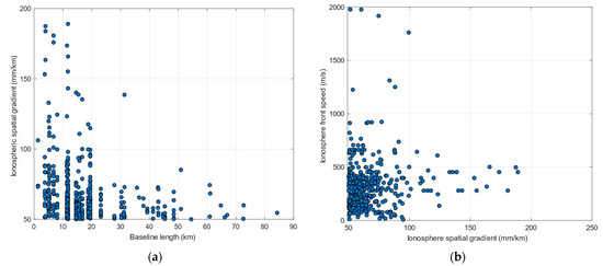 (a) Scatterplot of the ionospheric front slope and the baseline between monitoring stations; (b) Scatterplot of the ionospheric front speed and magnitude of the slope.