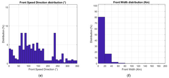 Figure 4a shows the distribution of the observed ionospheric gradient events. As one can see, the vast majority of the events are under 100 mm/km. The highest observed gradient is 189 mm/km, detected between the TM01 and TM05 stations separated by 11.76 km. As the solar activity was not at its maximum during the time period considered in this study, larger gradients might be expected when the solar activity is higher. Figure 4b illustrates the gradient distribution as a function of time/hour of day. Most of the events occurred during evening and nighttime. This can be explained by the average location of the auroral oval, which at night is centered over northern Scandinavia. This is also commensurate with the observations made in [41,42], both in terms of ROTI and ionospheric scintillation. Figure 4c,d illustrate the relationship of the distribution and the magnitude of the observed gradients with the satellite elevation angle. More than 45% of the events were observed on elevation angles below 15°. The absence of events on elevation angles above 85° can be explained by the absence of measurements due to satellite geometry on site. Most of the largest gradients were also observed at lower elevation angles ranging from 5° to 20°. Figure 4e shows the distribution of the observed gradients as a function of the ionosphere wave front direction of motion relative to the ground, whereas the distribution of the front width observations is shown in Figure 4f. The vast majority of the gradient width (or the scale size) estimates are below 20 km, indicating that most of the observations are small spatial scale events.