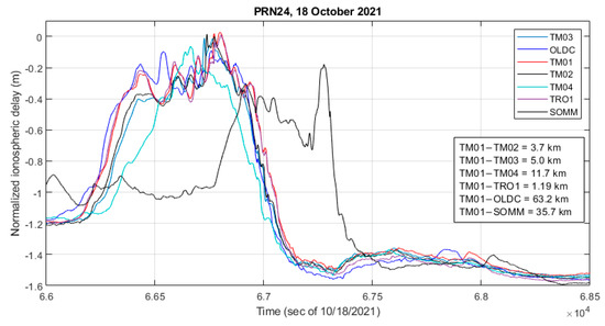 The subset of receivers is selected to visually emphasize the characteristics of the event. The rapid change in delay associated with both the leading and falling edges of the enhanced ionospheric delay feature took just a few minutes. In the case of the falling edge for example the decrease of about 1.2 m took 3.7 min. Observation of such spatially small-scale structures can be a challenge for larger scale networks. When comparing the results for individual stations in Figure 5, one can see that the underlying primary trend in the normalized traces is quite similar, but that each station experiences differences in the smaller scale and higher frequency ionospheric residuals. While the feature was propagating along the cluster in the North-West direction, the slopes on both the rising and falling edges changed, as can be observed in the cases of the TM04 and SOMM stations. When considering the longest slope at the falling edge of the feature, and using the TM01 station as a reference, correlation between the slopes observed by the TM01 and TM04 stations is 0.79, correlation between TM01 and SOMM is 0.74, while correlation between TM01 and the rest of the stations considered in Figure 5 is between 0.98 and 0.99.