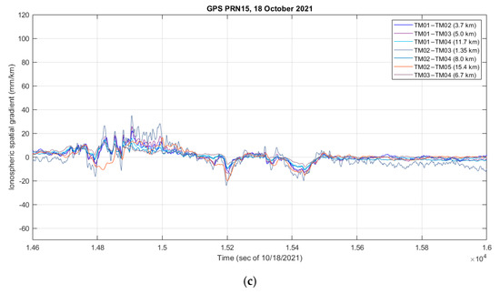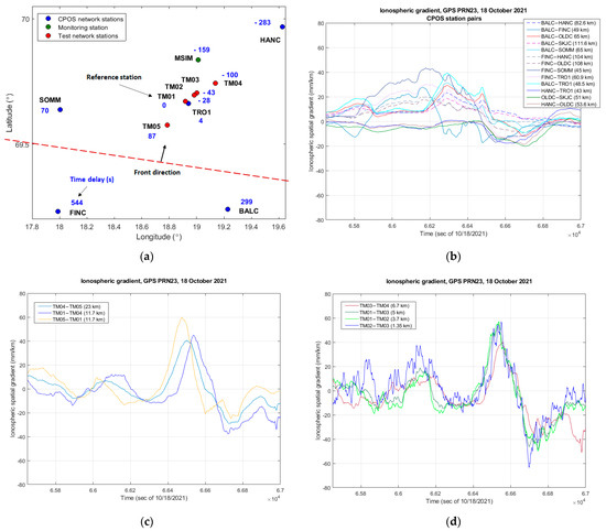 In this example, the ionospheric front was approaching the receiver cluster at 254 m/s from the South-West direction as shown in Figure 6a, indicating the observed time offsets with regard to the reference station. It is noted that in Figure 6a only the stations for which the time offset could be determined are shown. As shown in Figure 6b, the maximum observed peak-to-peak ionospheric spatial delay gradient value considering only the CPOS stations was about 56 mm/km within the plotted period (HANC-TRO1 station pair). Figure 6c,d show the same event as observed by stations located on shorter baselines, where noticeably higher peak-to-peak variation was detected. In particular, 105 mm/km considering the TM01–TM02 station pair, and 119 mm/km as observed considering TM02–TM03 with the caveat that this is a noisier trace given the shortest baseline length. While the variation between the observations shown in Figure 6c,d is relatively small, it is clearly visible that noise becomes a non-negligible component of the observations made on shorter baselines.