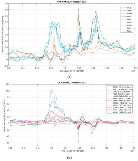 Figure 5 shows an example of the observed slant ionospheric delay variation. It should be noted that in this figure the normalized delay values are shown, thus only the variations of these delays should be examined.