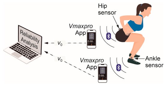 Experimental setup showing the locations of the two Vmaxpro devices: hip (close to the center of mass, as indicated by the manufacturer), and ankle (tibial malleolus). Data are sent to smartphones via Bluetooth and the take-off velocity v0 is used to conduct the reliability analysis.