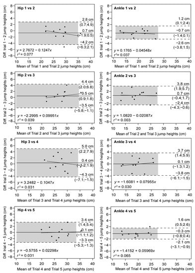Consistency between jumps was also studied using Bland–Altman plots, as shown in Figure 2. A high degree of concordance was observed in the test–retest analysis performed on the same day, as nearly all pairings were within the bounds of the upper and lower LoA. Additionally, the systematic error, represented by the mean difference, was determined to be low across all charts, with slightly higher values for the hip (−0.7 to 0.3 cm) than for the ankle (−0.2 to 0.5 cm). No significant trends were observed that suggest heteroscedasticity for a particular device or jump pairing, as the slope values, which indicate proportionality of error, ranged from 5 × 10−5 to −0.2. The Bland–Altman plots also reveal wider confidence intervals for the hip, suggesting greater measurement noise in this device.