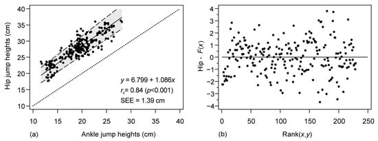 where ρ is the correlation coefficient, µ and σ2 are the means and variances for x and y. CCC can be split into two terms CCC = ρ × Cb, which indicates the degree of similarity between the jump height data obtained from the two devices, where ρ represents the precision of the measurement and Cb represents the accuracy of the measurement. An ideal scenario, where x = y, would result in a CCC of 1.0 [37]. The results obtained for the different correlation coefficients were classified as trivial (<0.1), small (0.1–0.29), moderate (0.3–0.49), high (0.5–0.69), very high (0.7–0.89), and practically perfect (>0.9) [38].