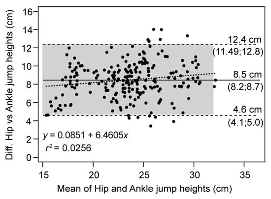 Additionally, the Bland–Altman plot shown in Figure 4 revealed a high systematic error, with a significant difference (p < 0.001) of 8.5 cm (95% CI: 8.20 to 8.72 cm) between devices, and LoA of 4.57 to 12.35 cm. The regression equation showed a slope of 0.0851 (95% CI: 0.02 to 0.15), indicating a degree of proportionality (heteroscedasticity). The differences increased with increasing jump values, but a value of r2 = 0.03 (less than 0.1) indicated lack of proportionality in the error. Finally, the maximum and minimum difference allowed was ±24 cm with the limits of agreement included in this range, and only 3.4% of the data was outside the limits of agreement.